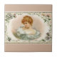 Ein Portrait einer Hübschen Viktorianischen Dame, die ein sanftes blaues Kleid trägt, umgeben von farbenfrohen Blume. Bild einer Viktorianischen Handelskarte auf beigem Hintergrund.