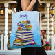 Personalisierte Tasche. Grafik einer Aquarellbilderei eines Stapels von hübschen Vintagen Büchern, die mit blauen und gelben Blumen bedeckt sind, in einem ai-Aquarell-Stil.