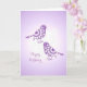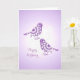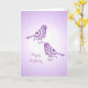 Eine sehr hübsche alles Gute zum Geburtstagkarte mit einer Vintagen inspirierten Illustration der elegant gemusterten lila und weißen Vögel und der Blumen.