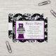 Stilvolle kundenspezifische Bäckereigeschäftskarte getan mit einem Schwarzweiss-Damastrahmen und lila Akzenten der hübschen Pflaume. Grafiken eines reizenden Schwarzweiss-Hochzeitskuchens, der auf einem hohen gedrehten lila Blumentopf sitzt, verziert die Front der Karte. Vervollkommnen Sie für ein Bäckereigeschäft, Partygeschäft oder einen unabhängigen kundenspezifischen Bäcker. Fertigen Sie die Textfelder besonders an, um für selbst oder Ihr Geschäft zu personifizieren.