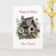 Geburtstagskarte für einen Freund. Niedliches rustikales Vogelhaus mit niedlichem Vogeldach, umgeben von hübschen Blume.
