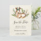 Save the Date Karte mit einem hübschen Hirsch, umgeben von üppiger Flora. Rustikales Boho Design.