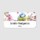 Namensschild mit einem niedlichen und skurrilen Muster. Heißluftballons und niedliche Wolken mit Gesichtern zwischen Sternen und Herzen und Ballons. Weiche Pastellfarben bilden dieses bezaubernde Design.