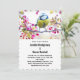 Hochzeitseinladung mit einem phantastischen Foto des niedlichsten kleinen Vogels auf einem Ast, der von rosa Blüten und grünen Blätter bedeckt ist. Der Vogel hat einen blauen Kopf und einen gelben Körper mit einem sehr süßen Gesicht. Schön.