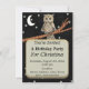 Diese Party Einladung ist schwarz mit einer hübschen, braunen Eule, die auf einem Baumarm sitzt und eine blaue Halskette unter einem weißen Halbmond und Sternen trägt. Passen Sie Ihre Informationen in der goldfarbenen Textbox mit den Vorlagen an.
