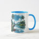 Ein atemberaubender Pfau steht anmutig und blickt über ein üppiges tropisches Paradies in diesem schönen Design.