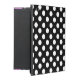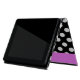 Stilvolle iPad Folio Gehäuse mit eingebautem Ständer aus schwarz-weißem Polka Punkt. Ein hellrosa Band, das an der rechten Front entlang läuft, und eine hellrosa Scheibe, an der mittleren Front, hat ein schwarzes Monogramm mit einem Buchstaben, das für die Personalisierung bereit ist. Eine großartige personalisierte Geschenkidee.