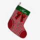 Hübscher roter und weißer Polkapunkt WeihnachtsStrumpf, mit festem rotem Flecken auf der Zehe und der Ferse. Grafiken eines grünen Bandes, an der Spitze, hat kundenspezifischen weißen Text und roten einen Satin, der Bogen, unterhalb des Textes schaut, wenn ein Sprig der Stechpalme ihn verziert. Personifizieren Sie den weißen Text zum Anzug Ihr Bedarf.