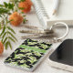 Ein hübscher rechteckiger, mit einem Kunst Nouveau Artmuster von Lilie-Von-d Valley auf einem schwarzen Hintergrund zu personifizieren Schlüsselanhänger; von der Posh u. Painterly "für die Liebe der Lilien" Sammlung.