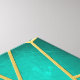 Ein dunkeltürkisfarbenes Mosaik, gerahmt mit goldenen Riegeln, erinnert an ein farbiges Glasmuster.