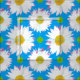 Ein sehr hübsches Blumengewebe mit einem nahtlos wiederholenden Muster der Gänseblümchen auf einem Himmel-Blauhintergrund, den Sie ändern können, wenn Sie wünschen. Der Teil der vornehmen und Painterly "Verkettungs" Sammlung, dieses Muster ist von einer handgemalten Papiercollage durch Judy Adamson.