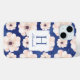 Ein stilvoller und hübscher monogramm iPhone 15 Gehäuse mit marineblau und pastellblau pfirsichfarbenem Blumenmuster und dem Initial und Namen Ihrer Wahl.