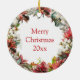 Personalisierte Weihnachtsschmuck. Aquarellbild einer Szene auf einem rustikalen Bauernhof mit einem braunen und weißen Kardinal oder Pfefferpferd und einem Holzzaun, der an einem Weihnachtswintertag in Kiefern, Beeren und Garland dekoriert ist.