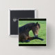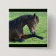 Knopf mit einem schönen Foto mit einem schönen braunen Pferd legen im Gras, Blick friedlich und inhaltlich.
