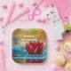 Teller mit einem Foto eines Teiches mit einer schönen roten Lotus-Blume, die oben rausragt.