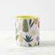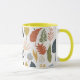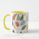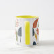 Gelbe Tasse mit farbenfrohen Mustern wie Blatt, Orange, Grün und Blau.