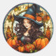 Dieser saisonale Aufkleber verfügt über eine hübsche Hexe mit Kürbissen und Herbstlauben in einer "Buntglasrunde". Digitales Bild mit AI-Unterstützung erstellt.