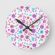 Eine hübsche, runde Wall-Uhr mit einem Muster von Blume in lila, türkis, rosa und orange auf weißem Hintergrund, aus einer handbemalten PapierCollage von Judy Adamson. Sie können die Hintergrundfarbe ganz einfach über die Schaltfläche Bearbeiten ändern.