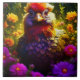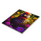 Hübscher, farbenfroher Garten mit lila und gelben Blumen und einem hübschen Hühnchen mitten im Grünen.