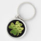 Eine elegante Schlüsselkette, die sich perfekt für die irische Klasse eignet! Es hat eine traditionelle keltische Kleeblatt-Form, die mit einem glänzenden grünen und goldenen Kleeblatt-Muster gefüllt ist und in einer dünnen goldenen Linie umrahmt ist. Das Bild wird auf einem dramatischen schwarzen Hintergrund platziert.