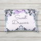 Dieses lila, blumenfarbene Baby-Kinderzimmer-Kissen für ein kleines Mädchen mit einem blühenden, süßen Blumenmotiv mit einer Lavendel-Blume und dunklen lila Beeren mit eukalyptusblauen grünen Blätter. Ideal für ein Mädchenzimmer, das einen Akzent auf dem Kinderzimmer eines Liebe lila oder eines Mädchens hat. Text sagt Sweet Dreams in einem niedlichen und trendigen, handgeschriebenen Stil.