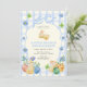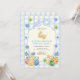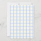 Osterbrunch- und Ostereiersuche-Einladung mit niedlichen Hasen. Wasserfarben-Illustration von Kaninchen, Frühlingsblumen und Eiern, sowie Rahmen mit Schleife auf babyblauem kariertem Hintergrund. Sie können die Einladung mit Ihrem Text anpassen.