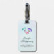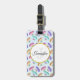 Gepäckanhänger mit einem schönen Muster. Aquarellschmetterlinge, in Pastellfarben, rosa, lila, blau, gelb und grün gestrichen. Ein hellblauer Aquarell mit Hellrosa. Legen Sie Ihren Namen und Monogramm-Buchstaben in einen weißen Kreis mit einer Imitat-Gold-Folie. Personalisierte Informationen auf der Rückseite.
