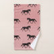 Hübsches rosa Tuch mit Bildern eines schwarzen Pferds mit wenig Herzen. Alle mögliche Pferdeliebhaber wurden Liebe dieses Reitertuch-Set.