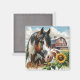 Hübscher Magnet mit einem braunen, schwarz-weißen gepunkteten Pferd, umgeben von Sonnenblumen und einer rustikalen roten Scheune im Hintergrund. Niedlich für ein Bauernhaus oder rustikales Thema oder für alle, die Pferde Lieben.