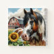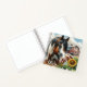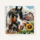 Hübsches personalisiertes Notizbuch mit einem braunen, schwarz-weiß gepunkteten Pferd, umgeben von Sonnenblumen und einer rustikalen roten Scheune im Hintergrund.