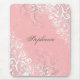 Schönes, hellrosa Mauspad mit Schnörkeln in weißem und grauem Barockstil. Grauer Text, in der Mitte, ist bereit, zu personalisieren, um zu lesen, was Sie gewollt. Schöne Ergänzung zu Ihrem Desktop und macht eine tolle Geschenkidee.
