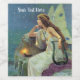 Dieses Etikett für eine Weinflasche hat eine hübsche Fee mit langen Haaren, die ein weißes Kleid trägt, das auf einer Felswand mit Harfe und einer beleuchteten Kerze unter einem blauen Nachthimmel sitzt. Passen Sie Ihren Text mit der Vorlage an.