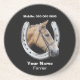 Ein Sandstein-Untersetzer mit einem Foto einer Kastanie Waliser-Stute innerhalb eines Hufeisens, auf einem schwarzen Hintergrund. Ein nützliches Geschäftsgeschenk für Hufschmiede oder Reitenlehrer, Ihre Kunden vergisst nie Ihre Telefonnummer.