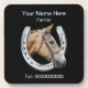 Ein Foto eines Kopfes des Kastanienpferds innerhalb eines Hufeisens auf einem kundengerechten schwarzen Hintergrund, wenn der Text für einen Hufschmied gegründet ist, als förderndes oder Werbungsgeschenk für Kunden. Fotografie u. Kunst durch ruralfrance.