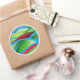 Eine abstrakte Landschaft mit lebhaften Farben und Texturen, die Hügel in grünen, blauen, zyanfarbenen, roten und rosa Schattierungen zeigt.