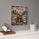 This appealing square wall clock features a highly dimensional illustration of two golden-brown bears hugging beside a stream or river. The artwork is rendered in warm brown, green, and pale orange tones, strongly suggesting a deep carved relief or Engraved Wood Look. The bears have highly textured fur and are positioned on a bank of grass and rocks. The background includes dense, stylized pine trees and layered mountains, indicating a woodland valley setting. The carving style gives the entire image a strong three-dimensional, sculpted quality. The large, three-dimensional embossed text "BESTIES for LIFE" is carved across the top. The clock face features a simple clock face border with large, white, numbered tick marks (1 to 12) integrated into the outer frame. The artwork is surrounded by a thick, dark brown decorative border that resembles a black wood frame.