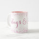 Ebenen des Glitzer in Rosa Erholung über und unter den Worten "Hugs & Kisses". Der zarte Drehbuch-Schriftart und die süßen Herzen schaffen eine weibliche Tasse für den Valentinstag.