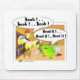 Eine Cartoonillustration eines Huhns und des Frosches, die eine Bibliothek besichtigen