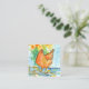 Eine lustige, quadratische Visitenkarte mit einer goldbraunen Henne, die sich um die Herbstlaube fressen, mit Sepia-Tinte skizziert und mit Aquarell mit blauem Aquarellhintergrund und Rückseite lackiert.