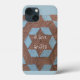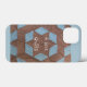 Quilt Block in braunem und blauem "Schloss" Muster. Die zentrale Burg ist eine braune Sternform, umgeben von der "6-seitigen Mauer" mit den "Uhrentürmen", die sich von der Mitte der Wände ausbreiten. Im Innentext steht "I Liebe Quilts"