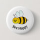 Niedliche schwarz-gelbe Cartoon Bumble Bee mit einem glücklichen Gesicht. Bee Happy in schwarzen Schriften unten.