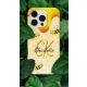 Gelber, weißer Hintergrund mit einem Bienenwabenmuster und glücklich lächelnden Hummeln. Dekoriert mit süßem, goldenem Honig, der tropft. Personalisieren und fügen Sie Ihren Namen und Ihre Monogramm-Initialen, goldene und schwarze Buchstaben. Der Name wird mit einem handgeschriebenen Stilskript geschrieben.