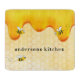 Gelber, weißer Hintergrund mit einem Bienenwabenmuster und glücklich lächelnden Hummeln. Dekoriert mit süßem, goldenem Honig, der tropft. Personalisieren und fügen Sie Ihren Namen und Ihre Monogramm-Initialen, goldene und schwarze Buchstaben. Der Name wird mit einem handgeschriebenen Stilskript geschrieben. Ideal für Ihre Zuhause im Sommer!