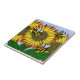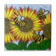 Eine Fliese mit drei lustigen Hummeln, die um große helle gelbe und orange Sonnenblumen summen.