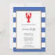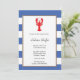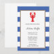 Ein roter Hummer auf einer Grenze des blauen Streifens. Geben Sie allen Ihrer Gäste eine helle und freundliche Erinnerung über Ihr bevorstehendes Meeresfrüchteabendessen mit dieser vibrierenden Hummereinladung.