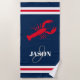 Hummermarineblau- u. -ROTstreifenBadetuch des kundenspezifischen Monogramms rotes. Cooles personalisiertes beachtowel für ihn. Machen Sie Ihren eigenen Strand oder Pooltuch für Sommer. Elegantes Geschenk für Freunde und Familie. Kundengerecht in den verschiedenen Farben. Marineblau- und -WEISS-Farbkombination. Noble Typografieschablone. Addieren Sie Ihr eigenes Namens-, lustiges Zitat oder Sprichwort. Groß. Seegeschenkideen für Männer und Frauen. Einzigartige Geschenke für Geburtstag, Hochzeit, Flitterwochen, Ruhestand und andere Gelegenheiten. Machen Sie ein für ihn, sie, Paar, weds eben, Ehemann, Ehefrau, Co-Arbeitskraft, Bruder, Großvater, Bootskapitän, Chef etc. Chicozeanthemaentwurf.