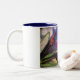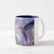 Weiße Tasse, blau bestickt mit dem Bild eines blauen Saphir-Kolibris, gemalt von Jo Ann Hayden