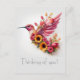 Ein fliegender Kolibri aus rosa Sonnenblumen, Gassen und Tulpen Front: "Denken Sie an Sie!" Gruß, den Sie selbst machen können.