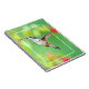 Ein Kolibri, der mitten in der Luft fotografiert wurde, mit Blume mit weichem Fokus als Hintergrund.
