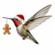 "hummingbird wearing red santa hat", "holding cookie christmas decoration", "gingerbread man tree ornament", "flying humming bird in flight", "ruby throated throat", "christmassy funny humorous humor", "cute wildlife birds fly", "hummer birding nature animals", "merry xmas bird lovers fans", "beak hanging carrying animal"